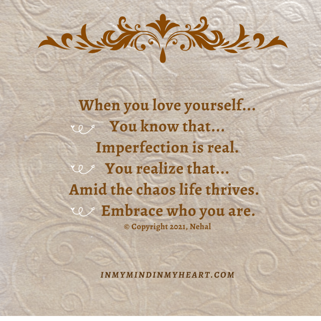 Daily Musings, My Musings, Nehal - English Poems, Nehal નેહલ नेहल When You Love Yourself…#2~ Nehal Share this: Click to share on X (Opens in new window) X Click to share on Facebook (Opens in new window) Facebook Click to share on WhatsApp (Opens in new window) WhatsApp Click to share on Pinterest (Opens in new window) Pinterest Click to share on Tumblr (Opens in new window) Tumblr More Click to print (Opens in new window) Print Click to email a link to a friend (Opens in new window) Email Like Loading... Related Published by Nehal I usually write in my mother tongue Gujarati and sometimes in Hindi and English. Nehal’s world is at the crossroads of my inner and outer worlds, hope you like the journey… View all posts by Nehal