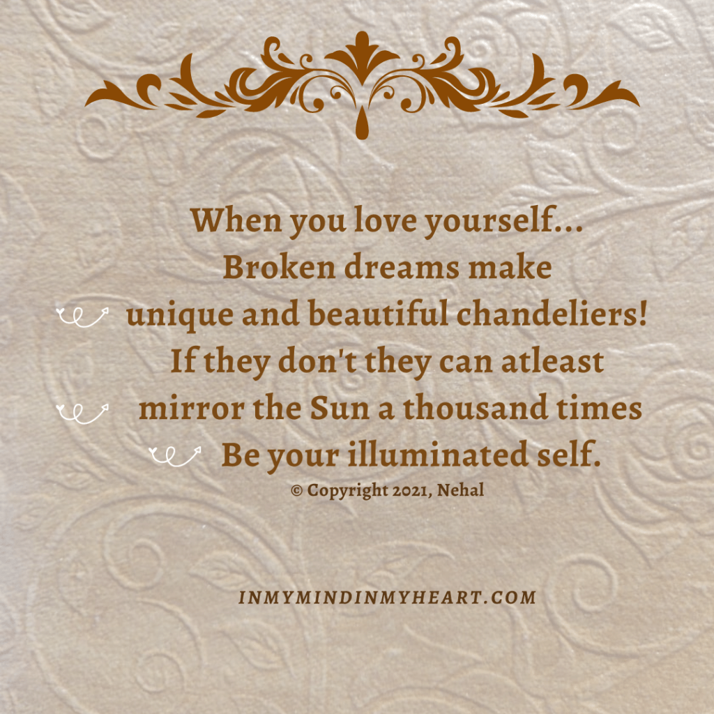 Daily Musings, My Musings, Nehal - English Poems, Nehal નેહલ नेहल When You Love Yourself…#4~ Nehal Share this: Click to share on X (Opens in new window) X Click to share on Facebook (Opens in new window) Facebook Click to share on WhatsApp (Opens in new window) WhatsApp Click to share on Pinterest (Opens in new window) Pinterest Click to share on Tumblr (Opens in new window) Tumblr More Click to print (Opens in new window) Print Click to email a link to a friend (Opens in new window) Email Like Loading... Related Published by Nehal I usually write in my mother tongue Gujarati and sometimes in Hindi and English. Nehal’s world is at the crossroads of my inner and outer worlds, hope you like the journey… View all posts by Nehal