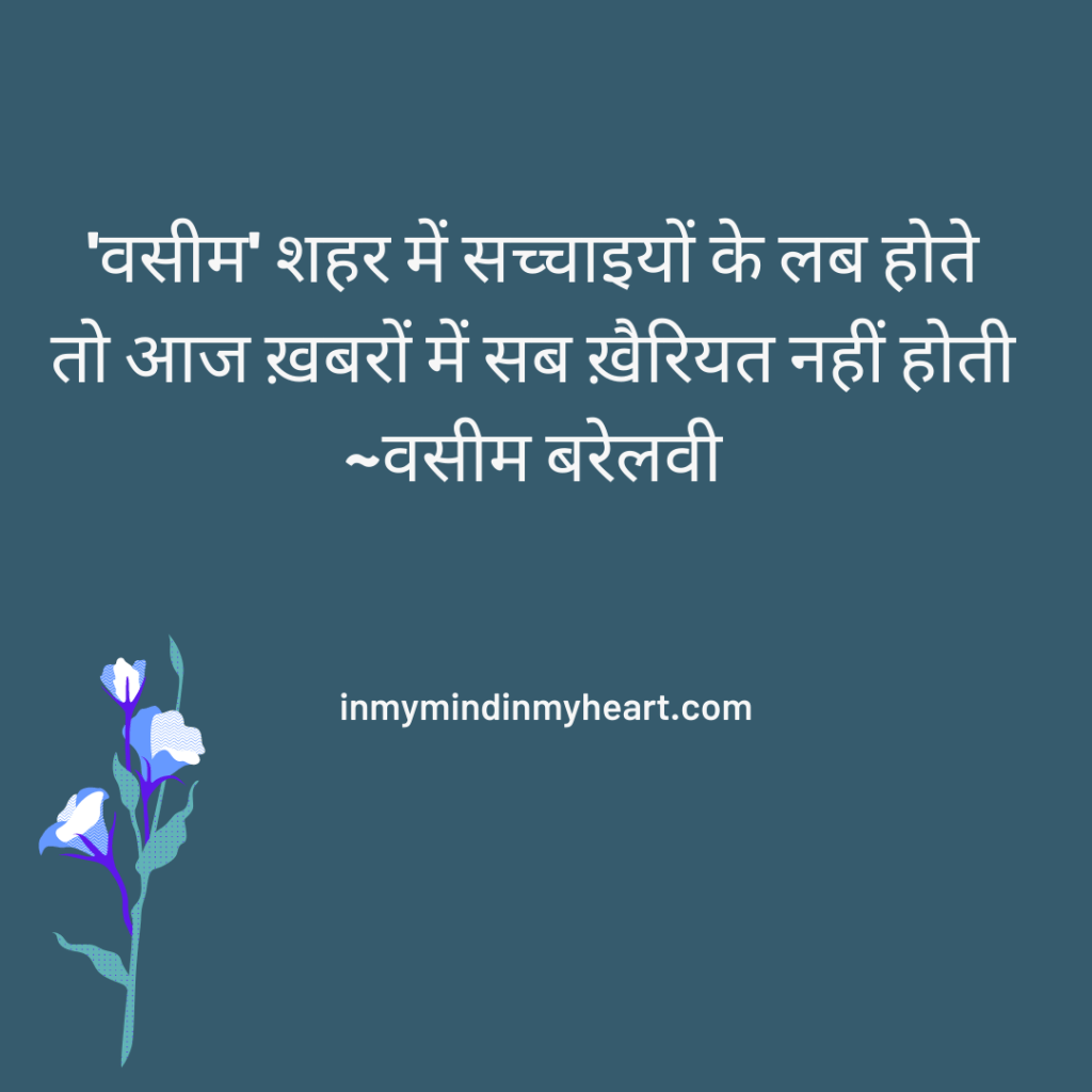 चुनिंदा अशआर, Daily Musings, Hindi Kavita हिन्दी कविता, Poetry, Waseem Barelvi वसीम बरेलवी आज का चुनिंदा अशआर : वसीम बरेलवी Share this: Click to share on X (Opens in new window) X Click to share on Facebook (Opens in new window) Facebook Click to share on WhatsApp (Opens in new window) WhatsApp Click to share on Pinterest (Opens in new window) Pinterest Click to share on Tumblr (Opens in new window) Tumblr More Click to print (Opens in new window) Print Click to email a link to a friend (Opens in new window) Email Like Loading... Related Published by Nehal I usually write in my mother tongue Gujarati and sometimes in Hindi and English. Nehal’s world is at the crossroads of my inner and outer worlds, hope you like the journey… View all posts by Nehal