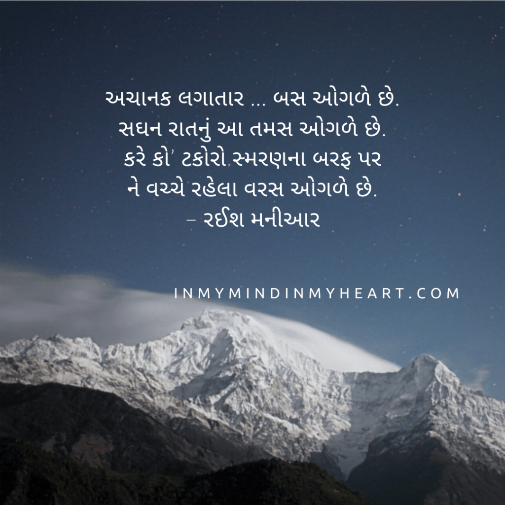 ચૂંટેલા શેર, Gujarati Kavita ગુજરાતી કવિતા, Poetry, Raeesh Maniar રઈશ મનીયાર આજની પંક્તિઓ : રઇશ મનીયાર Share this: Click to share on X (Opens in new window) X Click to share on Facebook (Opens in new window) Facebook Click to share on WhatsApp (Opens in new window) WhatsApp Click to share on Pinterest (Opens in new window) Pinterest Click to share on Tumblr (Opens in new window) Tumblr More Click to print (Opens in new window) Print Click to email a link to a friend (Opens in new window) Email Like Loading... Related Published by Nehal I usually write in my mother tongue Gujarati and sometimes in Hindi and English. Nehal’s world is at the crossroads of my inner and outer worlds, hope you like the journey… View all posts by Nehal